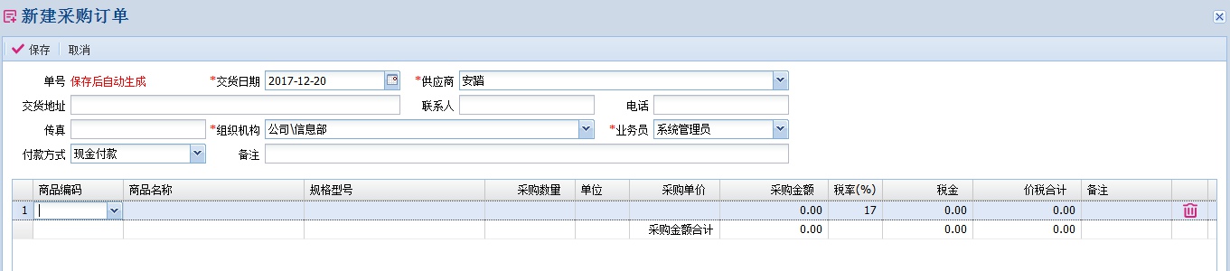 采购订单输入界面分为两个大的部分:上面的各个输入框构成了单据的主表部分,下面的表格构成了单据的明细部分。