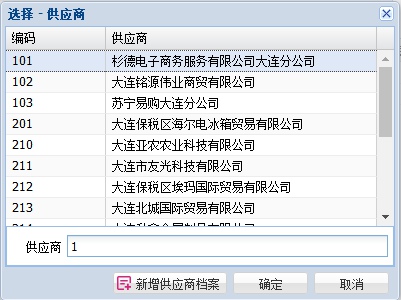 - 键盘操作:直接在输入框中输入供应商的编码的第一个字符、名称拼音字头的第一个字符。